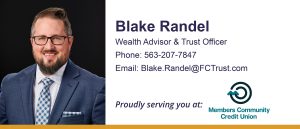 Blake is a Wealth Advisor & Trust Officer serving your hometown credit union members. He helps members with retirement planning, retirement income strategies, investment planning as well as estate planning and trust administration. He comes with more than 15 years in the insurance and financial services industry. Blake is a Kansas State University graduate who resides in Muscatine with his wife and children. In his free time, he enjoys live music, going on hikes and watching movies outside.